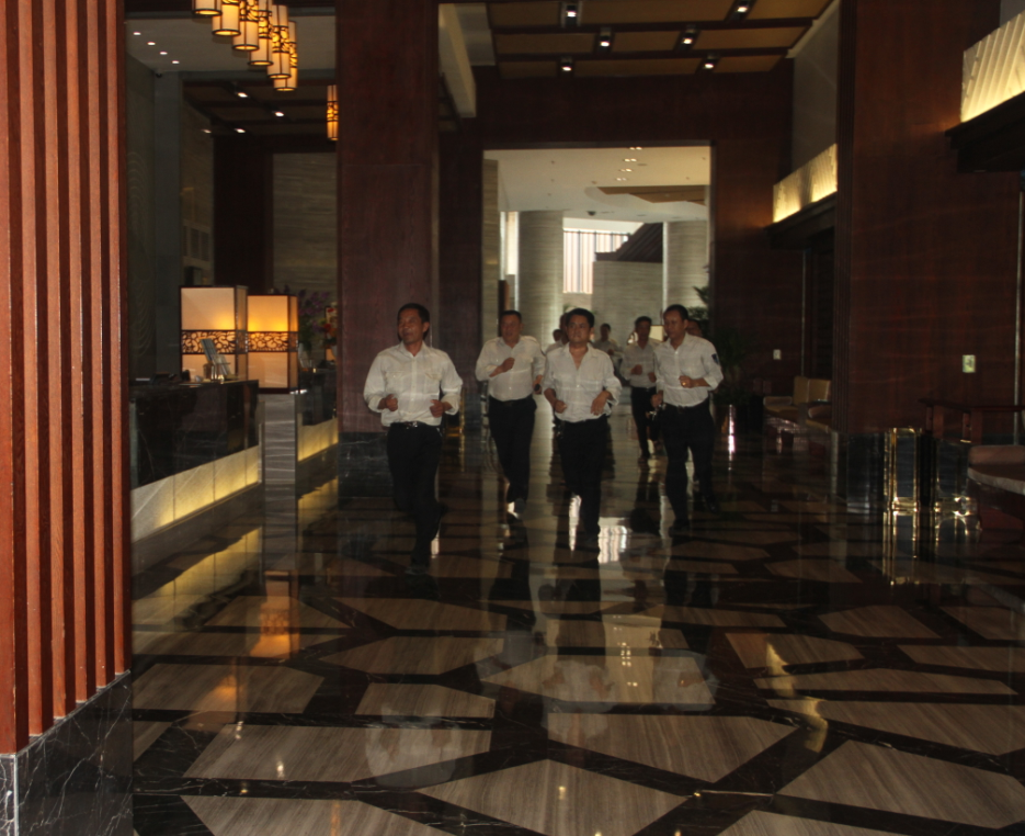 下午2點45分,酒店響起“著火”警報,酒店全體人員在安保人員的指揮和帶領(lǐng)下,迅速而有序的從安全通道撤離,沒有出現(xiàn)擁擠、踩踏、碰傷等安全事故,人員到達目的地后,快速整隊并核查人數(shù),整個應急演練活動規(guī)范、有序、緊湊、安全、高效,真正做到了“忙而不亂 慌而不驚”。