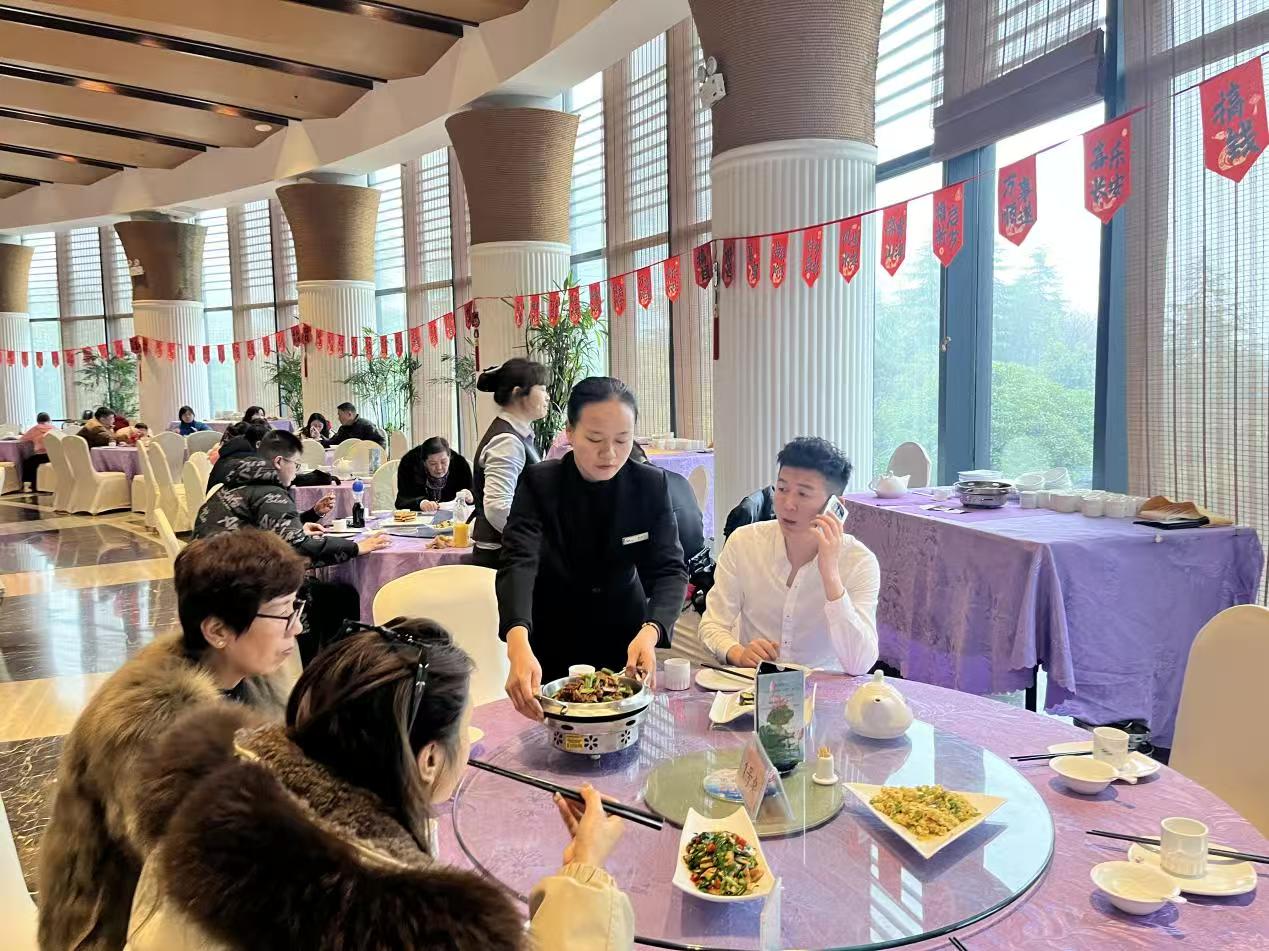 餐飲部門為了做好春節(jié)宴會接待,全員火力全開,忙得熱火朝天。廚房里,廚師們?nèi)褙炞?,精心烹制一道道色香味俱佳的美味佳肴。餐廳里,服務(wù)員們腳步匆匆,在餐桌間靈活穿梭,熱情地為賓客上菜、添茶,還時刻留意著桌面情況,及時清理殘渣,確保用餐環(huán)境始終保持整潔舒適,讓賓客能夠盡情享受美食與團(tuán)聚的歡樂。