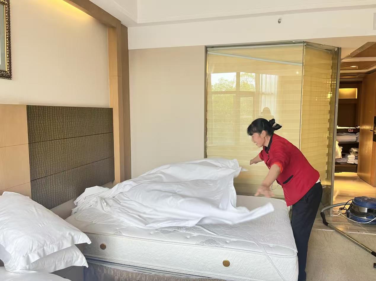 客房工作人員同樣毫不懈怠,她們秉持著認(rèn)真負(fù)責(zé)的態(tài)度,仔細(xì)打掃每一間客房。更換干凈的床上用品,將房間物品整理得井井有條,不放過任何一個衛(wèi)生死角,只為給賓客提供一個整潔、溫馨的休憩空間,讓每一位入住的客人都能擁有一夜好眠。