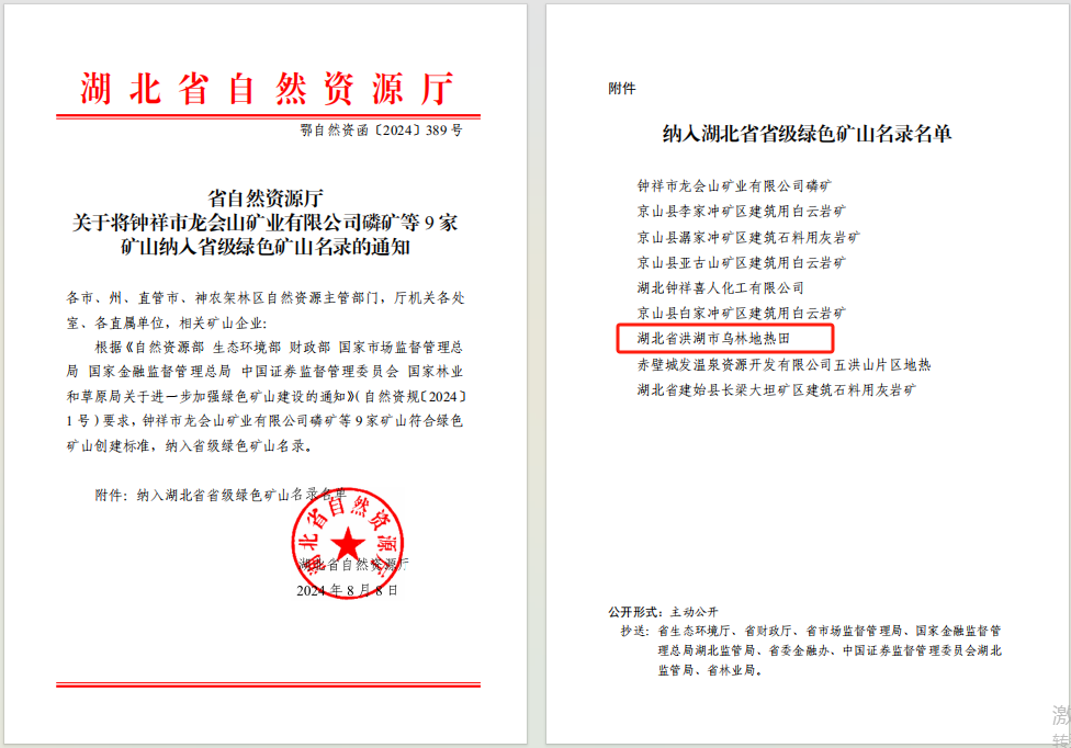悅兮半島烏林地?zé)崽锛{入省級綠色礦山名錄